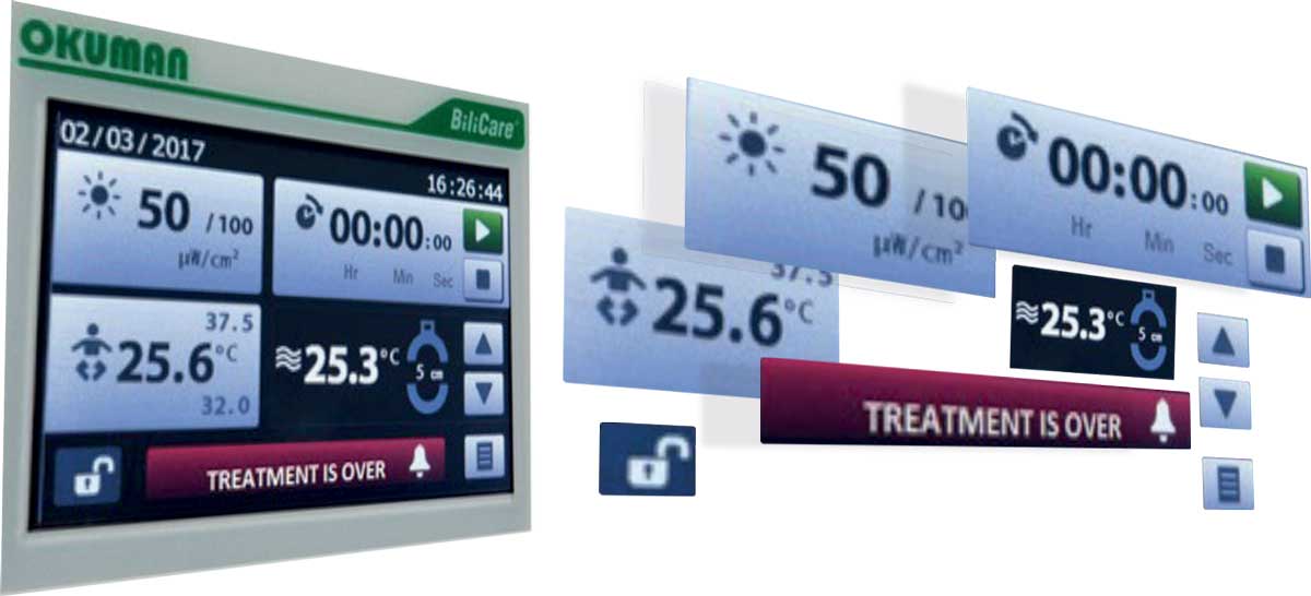 Мобільна лампа Okuman максимально пристосована для проведення ефективного курсу фототерапії. Довжина хвиль становить 450 - 470 нм при абсорбційному піку руйнування білірубіну в 458 нм.