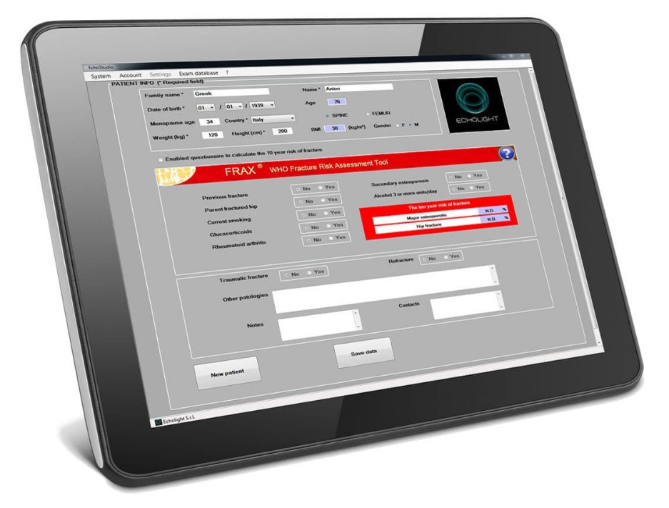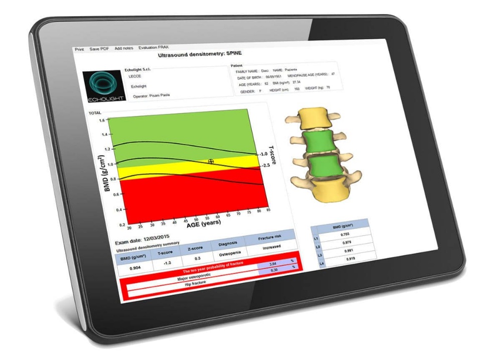 Специальный алгоритм позволяет получать полную картину состояния костной ткани в автоматическом режиме, а интегрированное программное обеспечение FRAX дает возможность вычитать 10-й летний риск общего перелома и перелома шейки бедра.