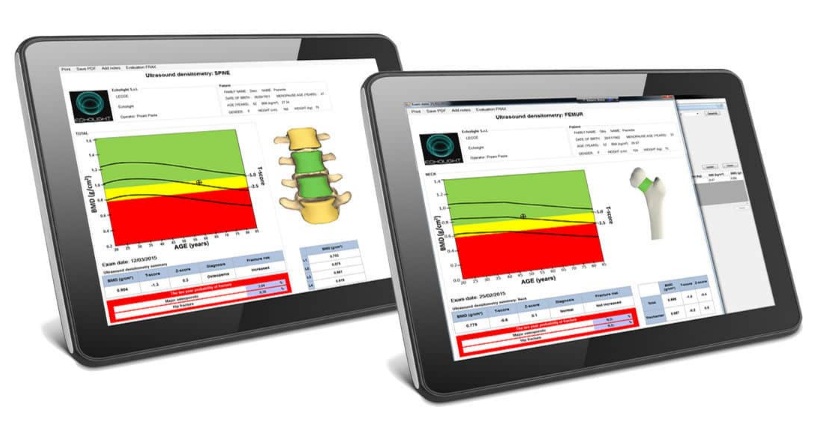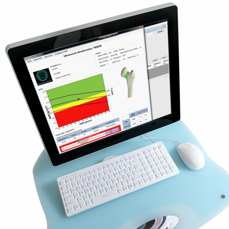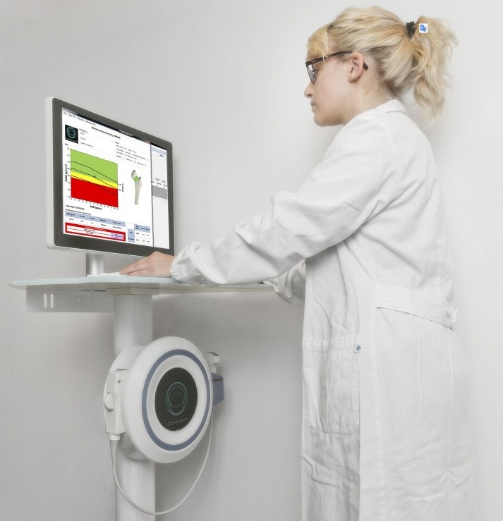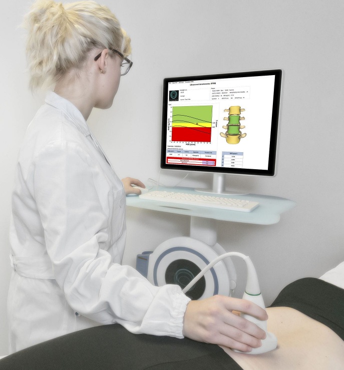 EchoStation - ультразвуковая денситометрическая станция нового поколения для определения характеристик костной ткани, оценки микроархитектоники кости и риска переломов на основе сканирования опорных участков скелета: позвонков поясничного отдела и проксимального отдела бедренной кости.