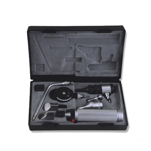 В диагностический набор входит батарейная/аккумуляторная рукоятка с замком и системой регулировки яркости, головка отоскопа, головка офтальмоскопа с колесиком для коррекции диапазона линз, назальной воронки, набора отоскопических воронок и инструмента для осмотра глотки.